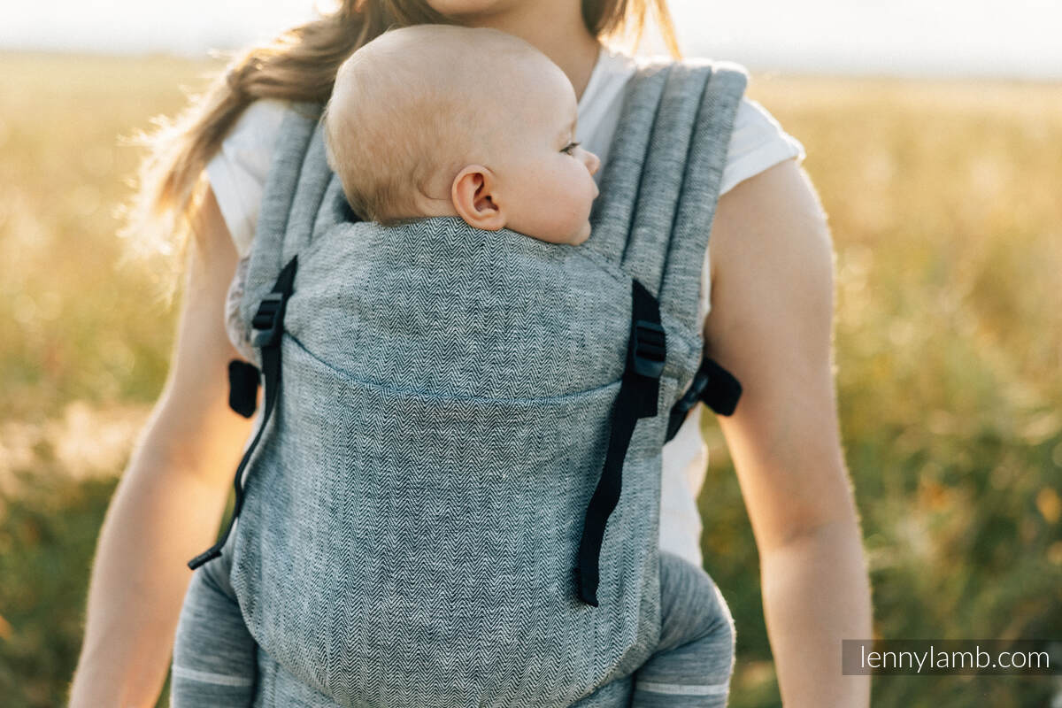 Złożony splot żakardowy tworzy teksturę, która pracuje razem z dzieckiem. Materiał zapewnia optymalne dociągnięcie panelu, co jest kluczowe dla najmniejszych niemowląt, jednocześnie oferując solidne podparcie dla cięższego starszaka.