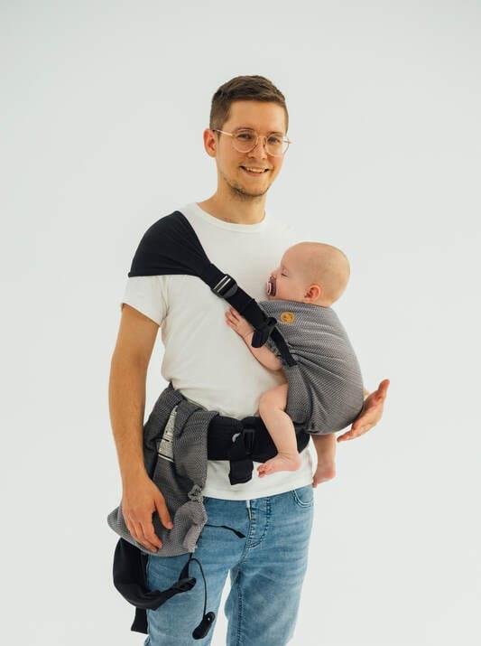 - Stabilny i wygodny, regulowany pas biodrowy oraz elastyczne ramię pozwalają łatwo i szybko dopasować nosidełko do rodziców o różnej budowie ciała.