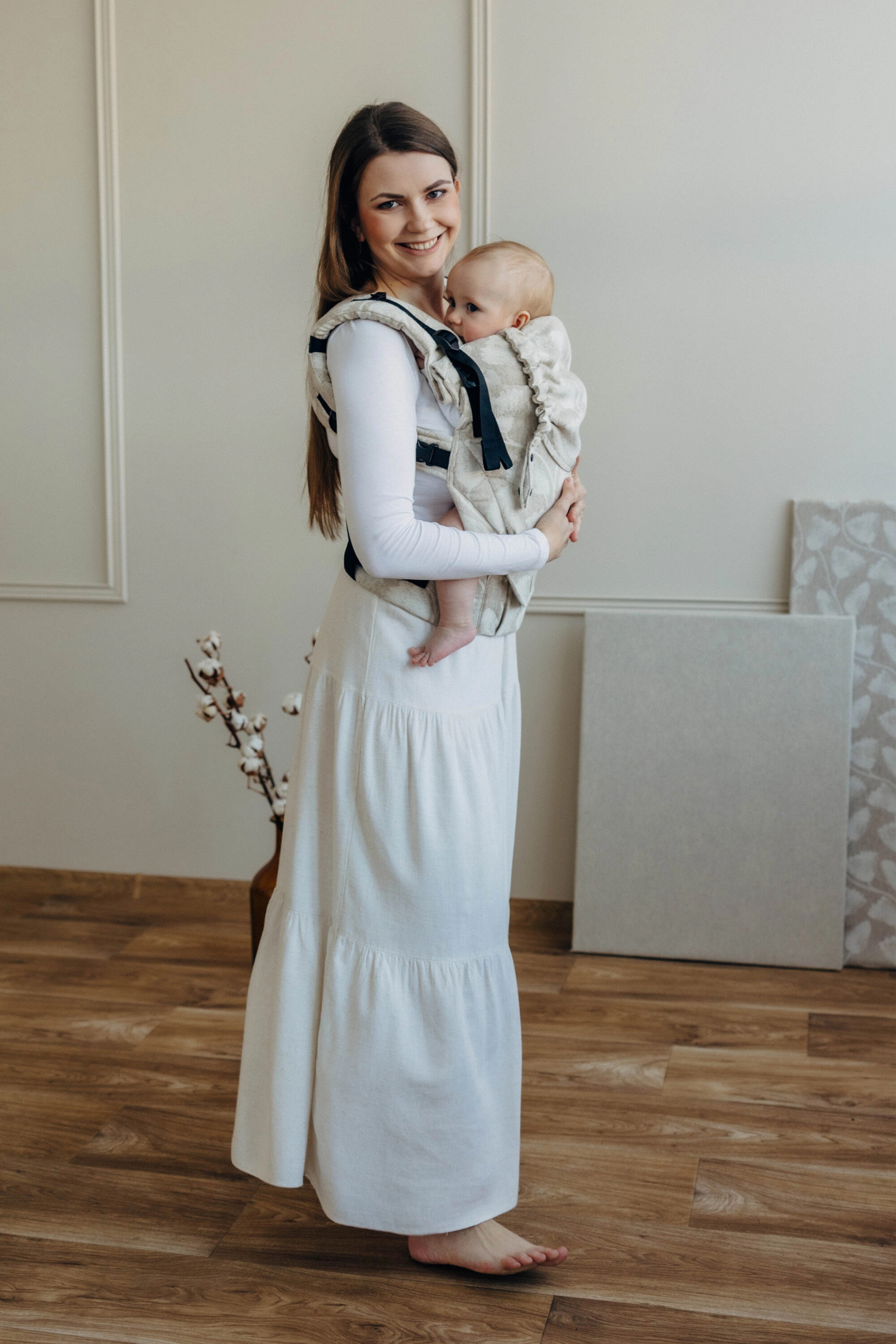 To raj dla maluszków, które potrzebują bezpiecznej pozycji żabki (M) i tkaniny, która otula bez ucisku. Mieszanka z konopiami i lyocellem jest wyjątkowo szlachetna i termoregulacyjna, więc zapewnia idealne wsparcie kręgosłupa rosnącego niemowlęcia. Płynna regulacja nosidełka gwarantuje, że oparcie precyzyjnie podtrzyma małe ciało aż do osiągnięcia przez nie ok. 104 cm wzrostu.