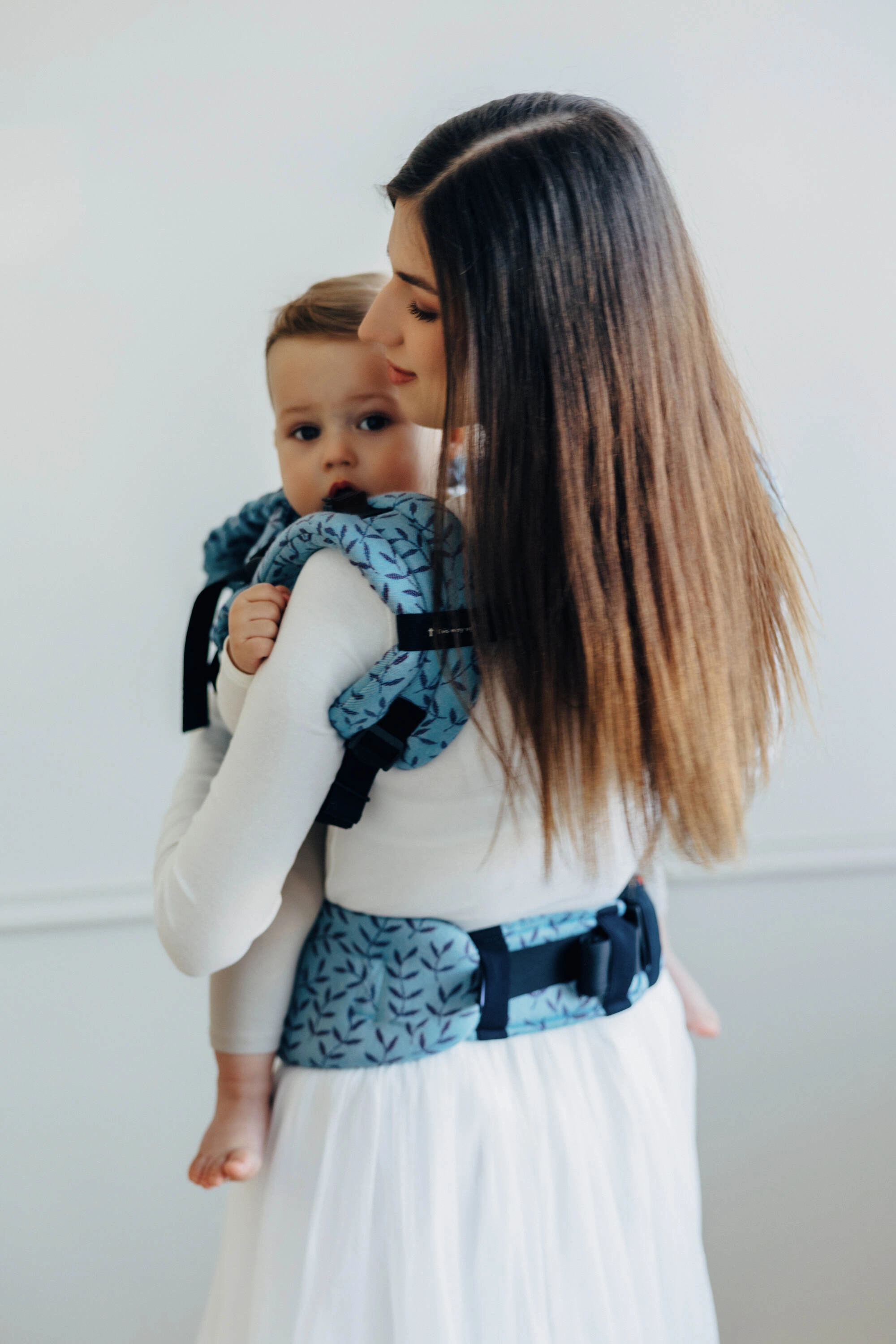 System rosnący z dzieckiem. Innowacyjna regulacja nosidełka pozwala na milimetrowe dopasowanie oparcia, dbając o zdrowy rozwój stawów biodrowych przez lata.