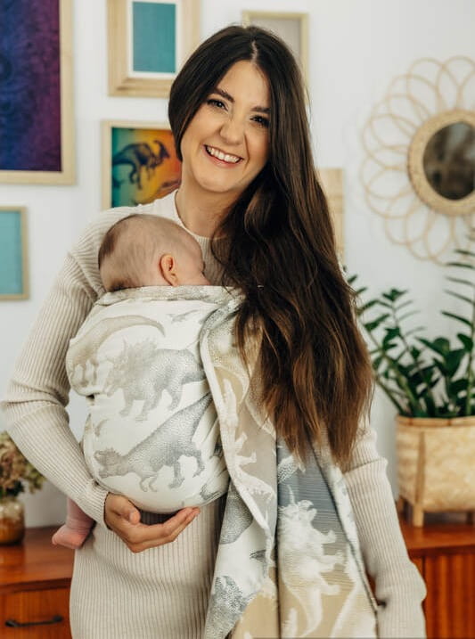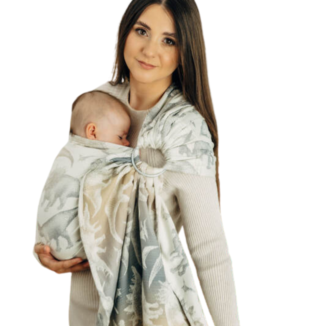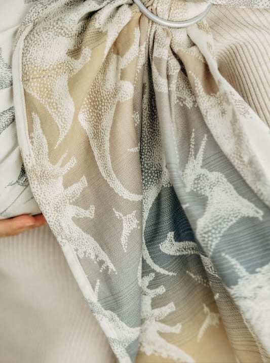 ★ Struktura antypoślizgowa Żakardowy wzór dinozaurów stawia delikatny opór, dzięki czemu dociągnięta w kółkach chusta nie luzuje się pod ciężarem dziecka.