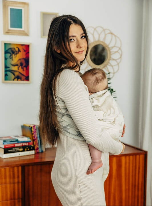 Prawidłowe ułożenie dziecka w chuście LennyLamb wspiera rozwój jego bioder i kręgosłupa. Materiał dociągnięty krawędź po krawędzi wymusza pozycję żabki (M) oraz naturalne zaokrąglenie pleców dziecka. Jest to profilaktyka dysplazji bioderek oraz wsparcie dla niedojrzałego układu kostnego maluszka.