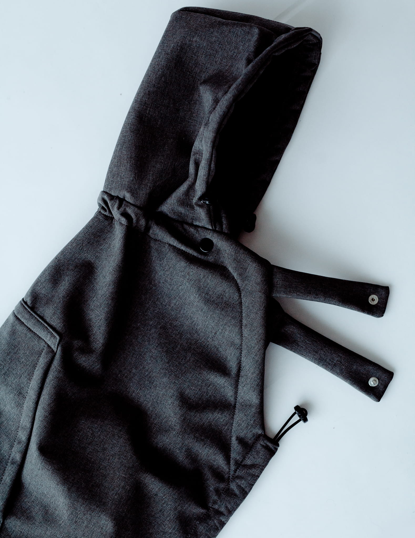 Osłonka softshell wyposażona jest w innowacyjny i prosty system regulacji. Wystarczy przymocować ją do obu pasów naramiennych nosidełka lub chusty, okryć maluszka a następnie wyregulować szerokość i wysokość gumkami ze stoperami. Taka regulacja zapewnia, że osłonka pasuje do każdego rodzaju nosidełek ergonomicznych i chust wiązanych.