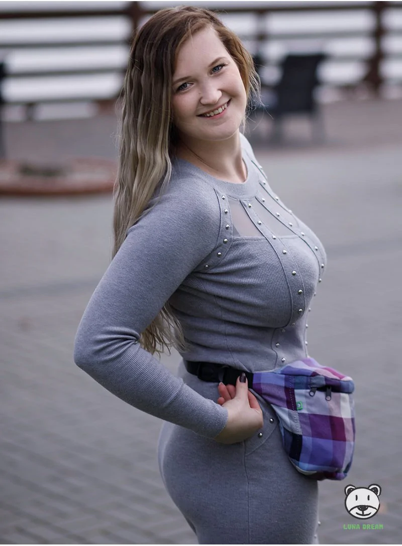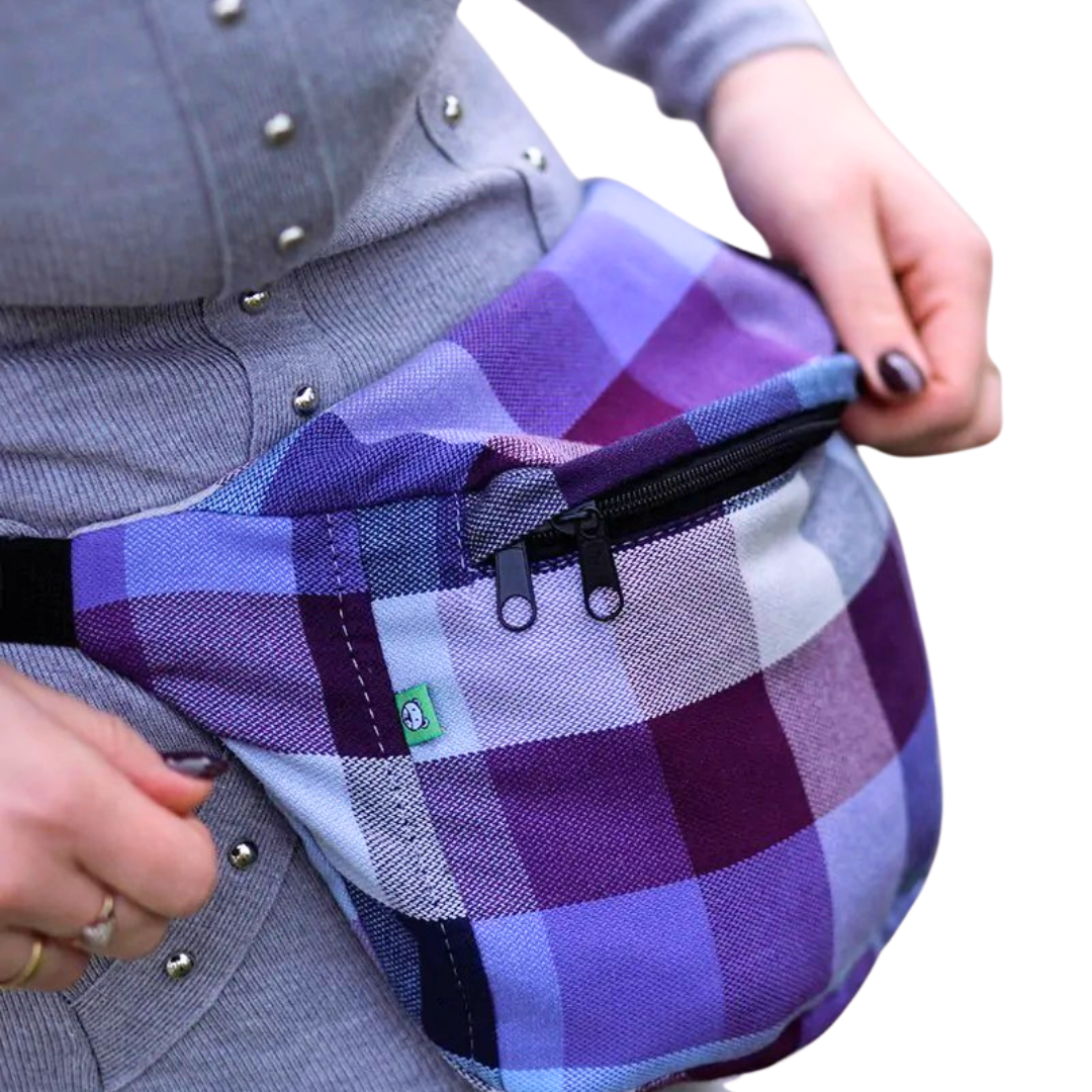 Nerka biodrowa wykonana z tkaniny chustowej. Jej rozmiar umożliwia zabranie najbardziej potrzebnych rzeczy podczas planowanego spaceru.
